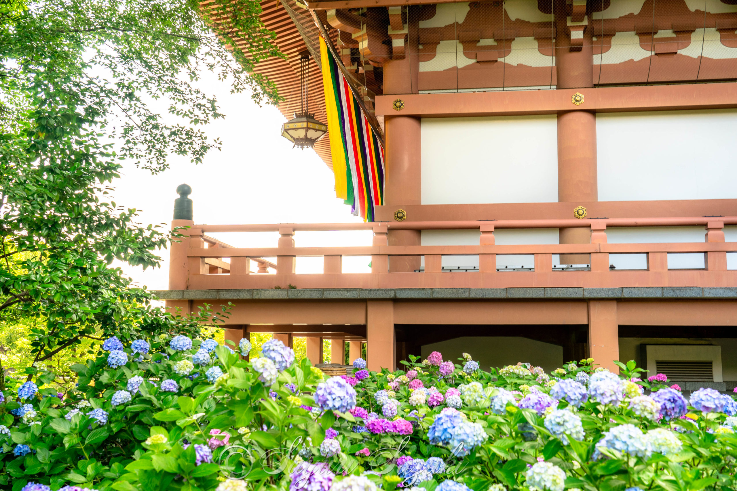 紫陽花の品種は少ないですが、境内には複数の紫陽花が咲いています。本堂の五色旗と一緒に撮影するのが、定番です!
